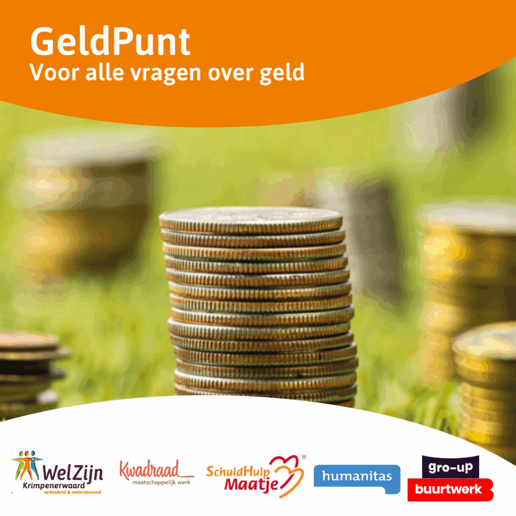 Heb je een vraag, kom je er even niet uit of wil je dat iemand met je meedenkt en kijkt? Het team van GeldPunt staat voor u klaar. Onze hulp is gratis. Bij het GeldPunt kunnen alle inwoners van de Krimpenerwaard op een laagdrempelige manier praten over geld. Dat kan per mail of bij het GeldPunt zelf. In het GeldPunt werken WelZijn Krimpenerwaard, Kwadraad, Humanitas Thuisadministratie, Stichting Budgethulp Krimpenerwaard, Gro-Up (jongerenwerk) en de gemeente samen.